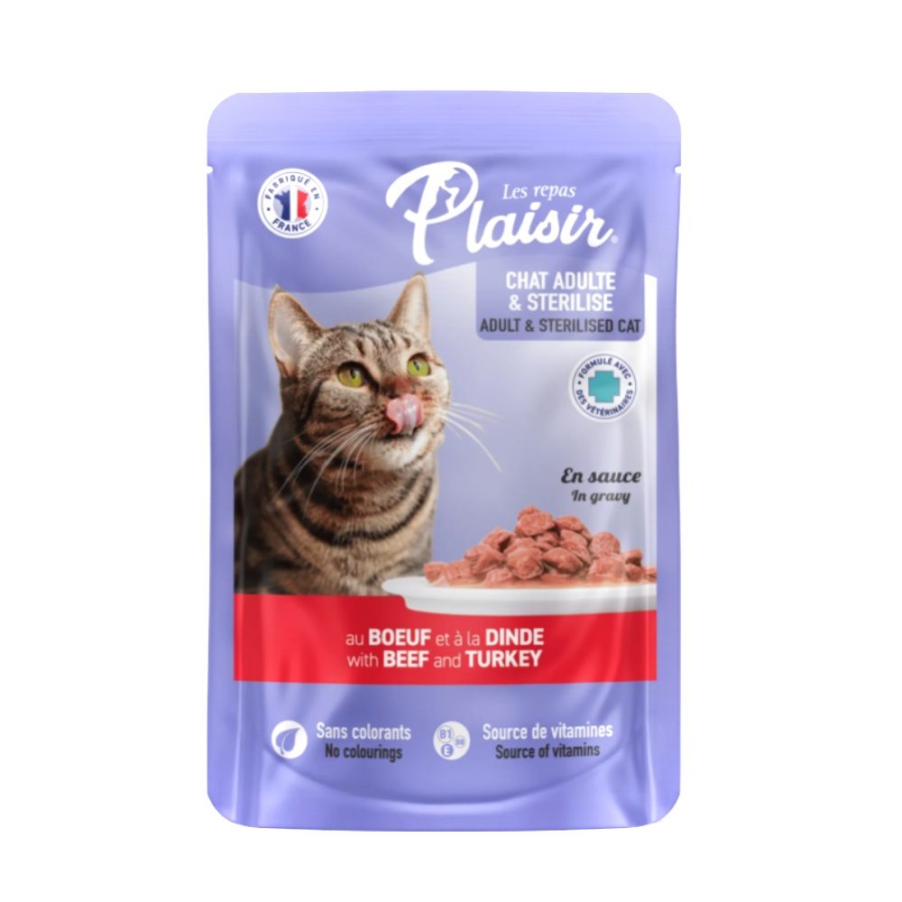 Kapsička Plaisir Adult s hovězím a krůtím masem je kompletním krmivem pro dospělé kočky.