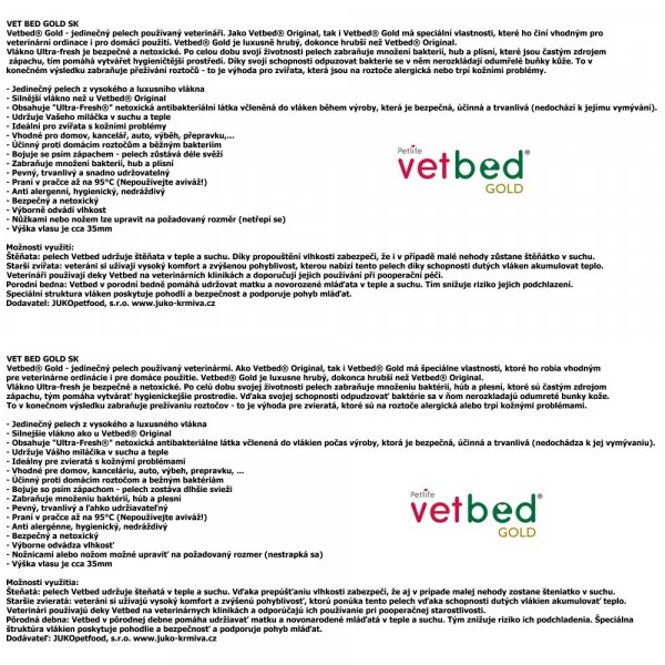Vetbed® Gold - jedinečný pelech používaný veterináři. Jako Vetbed® Original, tak i Vetbed® Gold má speciální vlastnosti, které ho činí vhodným pro veterinární ordinace i pro domácí použití. Vetbed® Gold je luxusně hrubý, dokonce hrubší než Vetbed® Original.