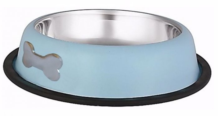 Nerezová miska, která zaujme také svým vzhledem. Vnější stranu ve světle modré barvě doplňuje znak kosti. Spodní okraj je opatřen gumou, miska neklouže po podlaze.