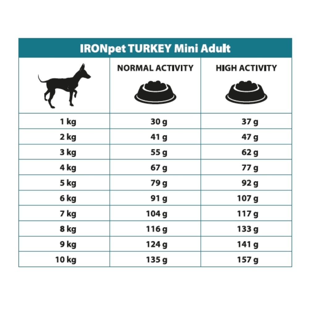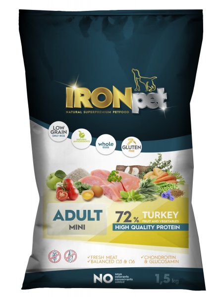 IRONpet TURKEY Mini Adult 1,5kg IRONpet TURKEY Mini Adult je kompletní krmivo bez obsahu lepku a kuřecího masa pro dospělé psy malých plemen. Obsahuje 45% kvalitního masa z krocana.