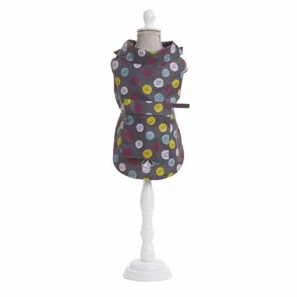 Elegantní pláštěnka pro psa potištěná motivem barevných koleček na šedém podkladu. Podšitá.