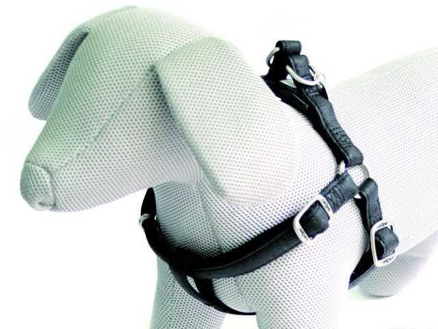 Kožený postroj černé barvy s celopotiskem, podšitý jemným nylonem ve stejné barvě.