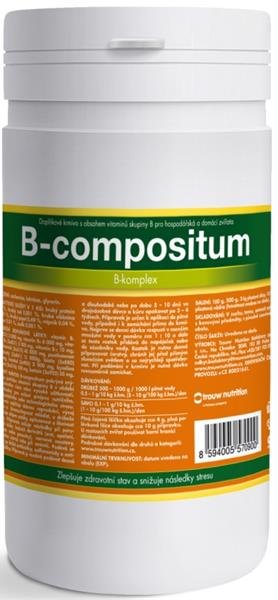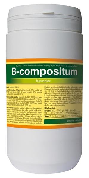 Vitamin B1, Vitamin B2, Vitamin B6, Vitamin B12, Niacinamid, Pantotenan vápenatý, Biotin, Inositol. Krmný návod: Doplňkové krmivo B-compositum se používá při výskytu poruch vyplývajících z nedostatku vitaminů skupiny B, poruchy kůže, opeření a srsti, nervové soustavy, při anémii, perosis, při zátěži vznikající v období intenzivního růstu, vysoké užitkovosti i jiném stresu. Velmi vhodné je jeho používání u zvířat v reprodukci ( zlepšení reprodukčních schopností zvířat, snížení embryonální úmrtnosti, dále pro dobrý vývoj plodu a zlepšení následné životaschopnosti mláďat ), u drůbeže ve snášce, u mláďat, v rekonvalescenci, po léčbě antibiotiky, sulfonamidy a antikokcidiky.