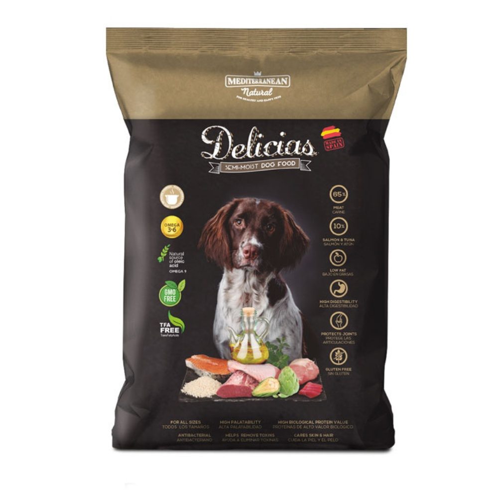 Delicias poloměkké krmivo pro psy obsahuje extrakt z krabů a extrakt z krevet (zdroj glukosaminu), který podporuje vývoj chrupavkových tkání. Balení lze vzduchotěsně uzavřít. Produkt neobsahuje GMO ani trans-mastné kyseliny, je bohatý na mastné kyseliny Omega 3 a 6.