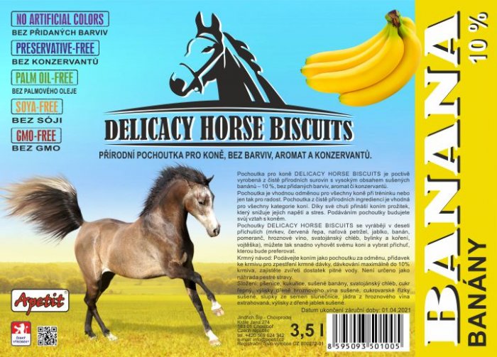 Pochoutka pro koně DELICACY HORSE BISCUITS je poctivě vyrobená z čistě přírodních surovin s vysokým obsahem sušených banánů – 10 %, bez přidaných barviv, aromat či konzervantů.