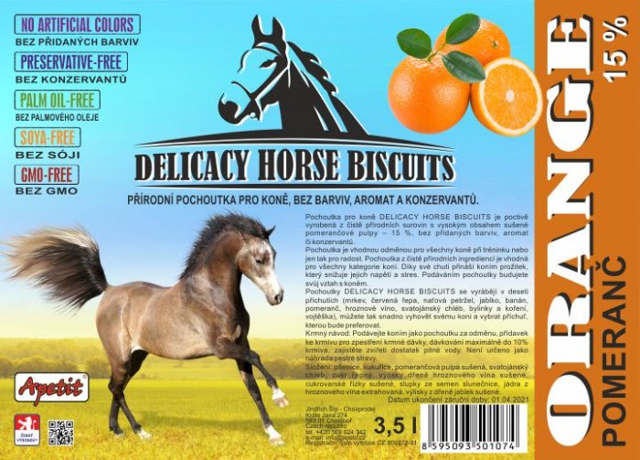 Pochoutka pro koně DELICACY HORSE BISCUITS je poctivě vyrobená z čistě přírodních surovin s vysokým obsahem sušené pomerančové pulpy – 15 %, bez přidaných barviv, aromat či konzervantů.