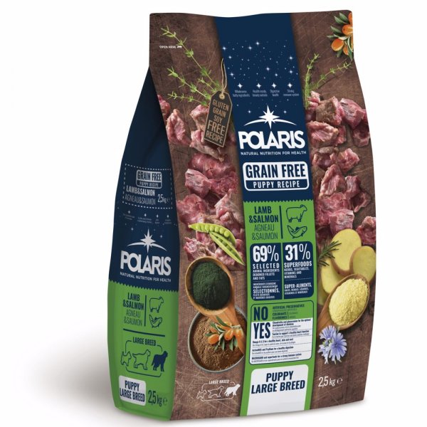 Vykostěné jehněčí (25 %), sušené vepřové (24 %), bramborové vločky (17 %), hrách (12 %), sušený losos (11 %), bramborový škrob, drůbeží tuk, hydrolyzovaná živočišná bílkovina, sušené řepné řízky (3,5 %), kvasnice (3 %), lněné semínko (1,5 %), vitaminy a minerály, lososový olej (0,5 %), psyllium (0,5 %), extrakt z yuccy schidigery (0,2 %), spirulina (0,2 %), ActiveMOS (0,2 %), MACROGARD (0,1 %), rakytník (0,1 %), bylinky (rozmarýn, tymián, petržel, 0,1 %), chondroitin sulfát (270 mg/kg), glukosamin sulfát (200 mg/kg), L-karnitin (100 mg/kg).