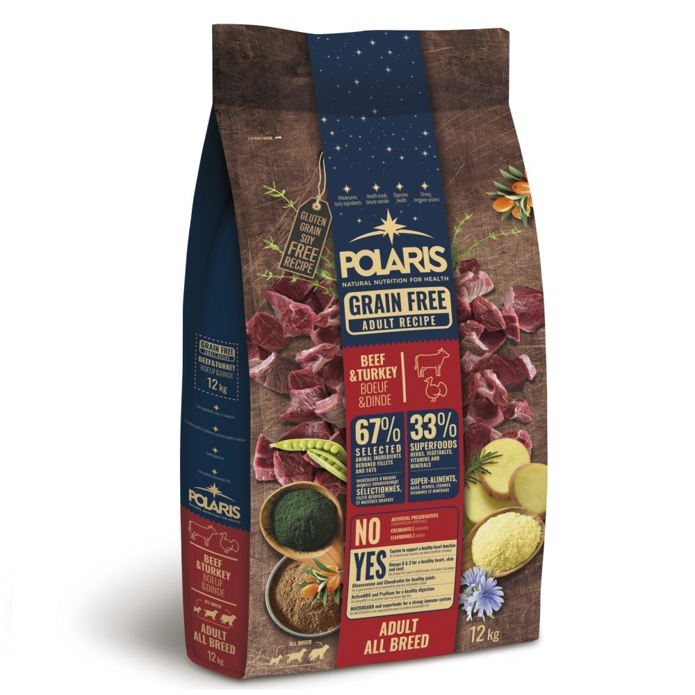Vykostěné hovězí (25 %), bramborové vločky (20 %), sušené vepřové (19 %), sušená krůta (13 %), hrách (12 %), bramborový škrob, drůbeží tuk, sušené řepné řízky (4 %), hydrolyzovaná živočišná bílkovina, kvasnice (3 %), vitaminy a minerály, lososový olej (0,5 %), psyllium (0,5 %), extrakt z yuccy schidigery (0,2 %), spirulina (0,2 %), ActiveMOS (0,2 %), MACROGARD (0,1 %), rakytník (0,1 %), bylinky (rozmarýn, tymián, petržel, 0,1 %), chondroitin sulfát (270 mg/kg), glukosamin sulfát (200 mg/kg), L-karnitin (100 mg/kg).