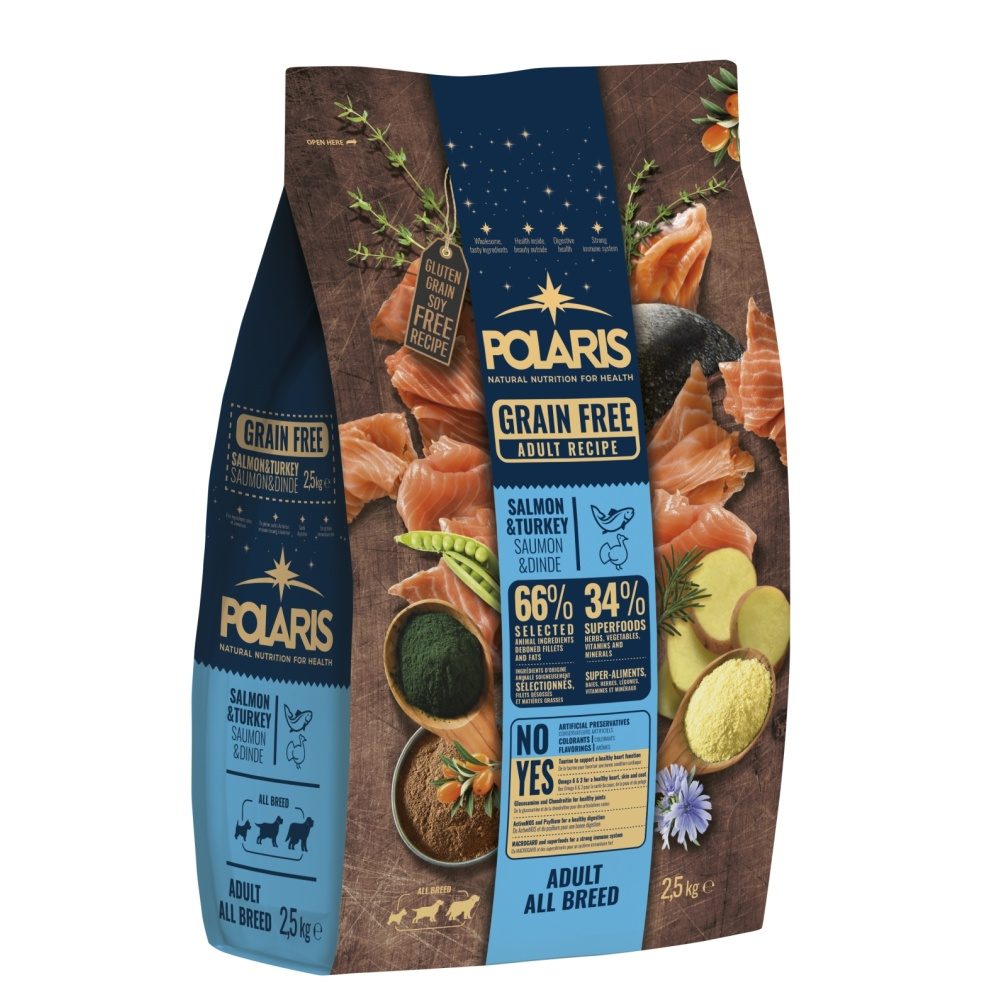 Složení: Vykostěný losos (25 %), bramborové vločky (20 %), sušené vepřové (17 %), drůbeží tuk, hrách (11 %), sušená krůta (8 %), bramborový škrob, sušené řepné řízky (4 %), hydrolyzovaná živočišná bílkovina, kvasnice (3 %), sušená čekanka (2 %), lněné semínko (1,5 %), vitaminy a minerály, lososový olej (0,5 %), psyllium (0,5 %), extrakt z yuccy schidigery (0,2 %), spirulina (0,2 %), ActiveMOS (0,2 %), MACROGARD (0,1 %), rakytník (0,1 %), bylinky (rozmarýn, tymián, petržel, 0,1 %), chondroitin sulfát (270 mg/kg), glukosamin sulfát (200 mg/kg).