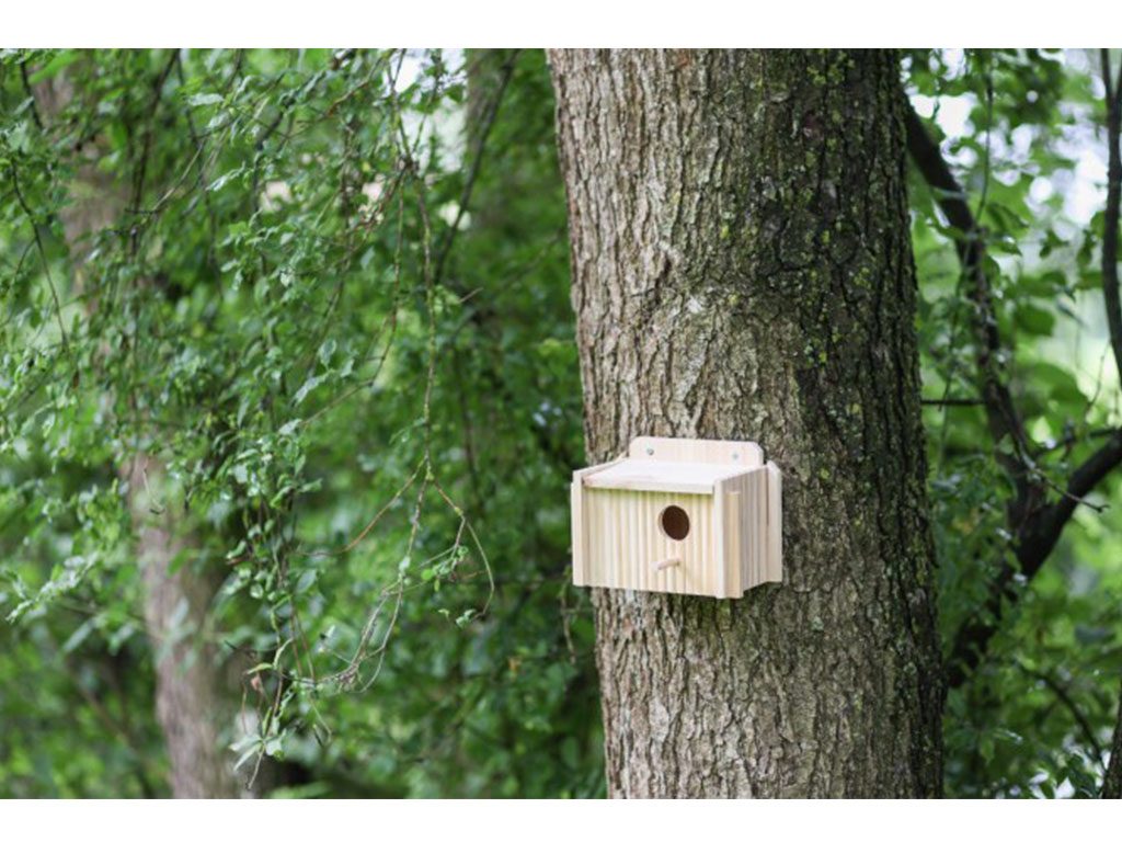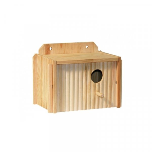 Dřevěná hnízdní budka pro malé ptactvo s odklápěcí střechou pro snadné čištění a s bidélkem pro přistávání ptáků. Tato budka funguje jako hnízdo pro hnízdění ptáků.