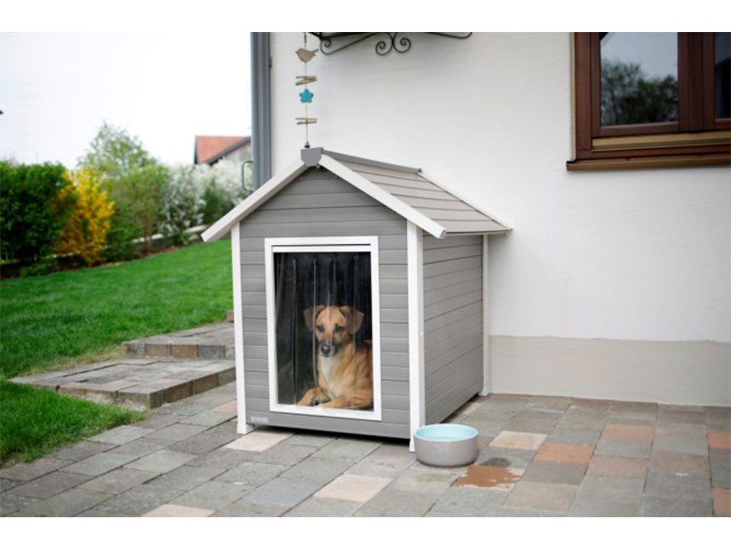Vchod je krytý odnímatelným transparentním lamelovým závěsem, který chrání psa před deštěm, částečně také před chladem nebo větrem a v teplém letním období je jednoduše demontovatelný.