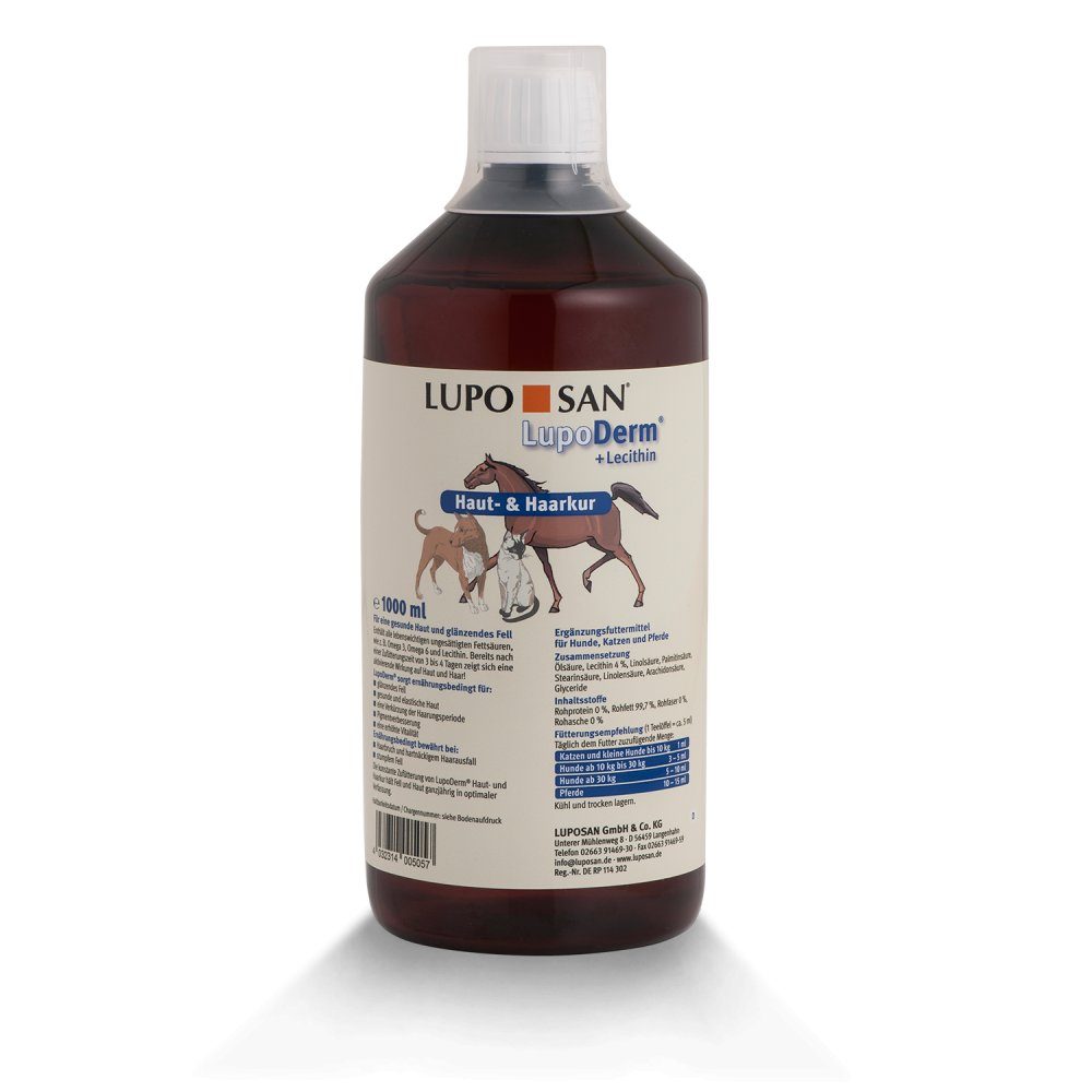 Již po pár dnech podávání bude patrný skvělý výsledek a Vašemu pejskovi bude tento doplněk potravy skvěle chutnat. Doplněk potravy pro psy, kočky i koně pro zdravou kůži a lesklou srst Obsahuje všechny životně důležité nenasycené mastné kyseliny, např. omega 3, omega 6 a lecitin. Již po 3-4 dnech jsou patrné první účinky na kůži a srsti. Lupoderm zajišťuje: lesklou srst zdravou a pružnou kůži zkrácení doby línání zlepšení pigmentace srsti/li> zvýšení vitality Tento preparát se osvědčil při: lámavé srsti a jejím silném vypadávání matné srsti zápachu z tlamy svědivé, nebo šupící se kůži při kožních potížích ► Pravidelné přikrmování LupoDerm - kůže a srst udržuje zdravé trávení, kůži i srst po celý rok v optimálním stavu.
