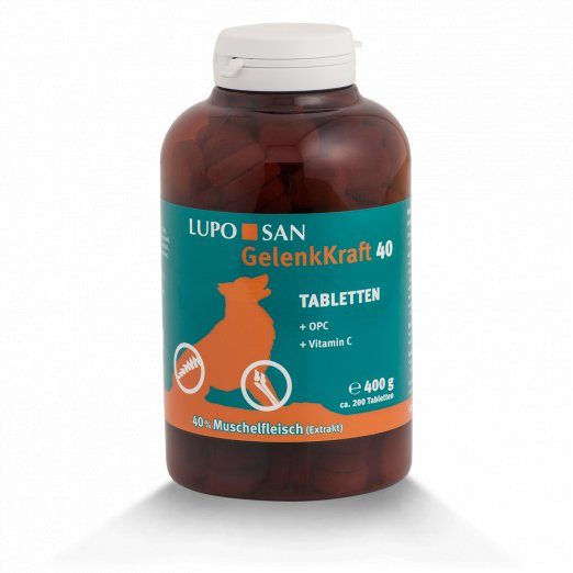 Luposan Gelenk40 ve formě tablet posiluje klouby a vyznačuje se jedinečným komplexem živin s 40% extraktem masa mušlí druhu Perna Canaliculus, vysoký podíl GAG (glykosaminoglykanů), OPC (z vinných jadérek) a vitamín C (z barbadoské třešně), kyselinu gama linolovou a omega-3 mastné kyseliny i výtažek z pupalky a divokého lososa, což je ideální doplněk potravy při zánětlivých problémech s klouby. Chrání a posiluje klouby, chrupavky, pojivovou tkáň, vazivo a šlachy, podporuje výstavbu chrupavek a tvorbu synovie (kloubního mazu), zvyšuje pružnost pojivové tkáně, posiluje odolnost a motivaci zejména při tréninku a podporuje také fenu i její plod v období březosti a růstu.