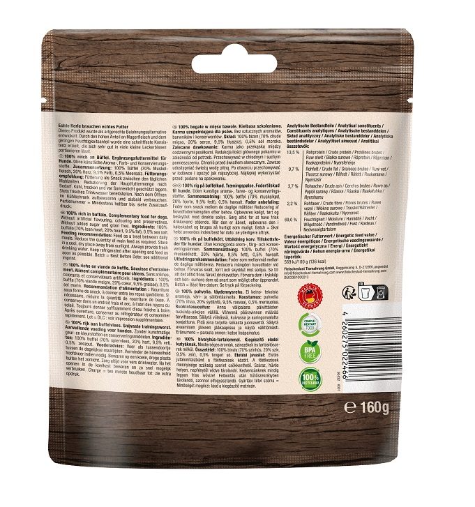 Složení: 100 % buvol (skládá se ze 70 % libového masa, 20 % srdce, 9.5 % tuku a 0.5 % mořské soli).