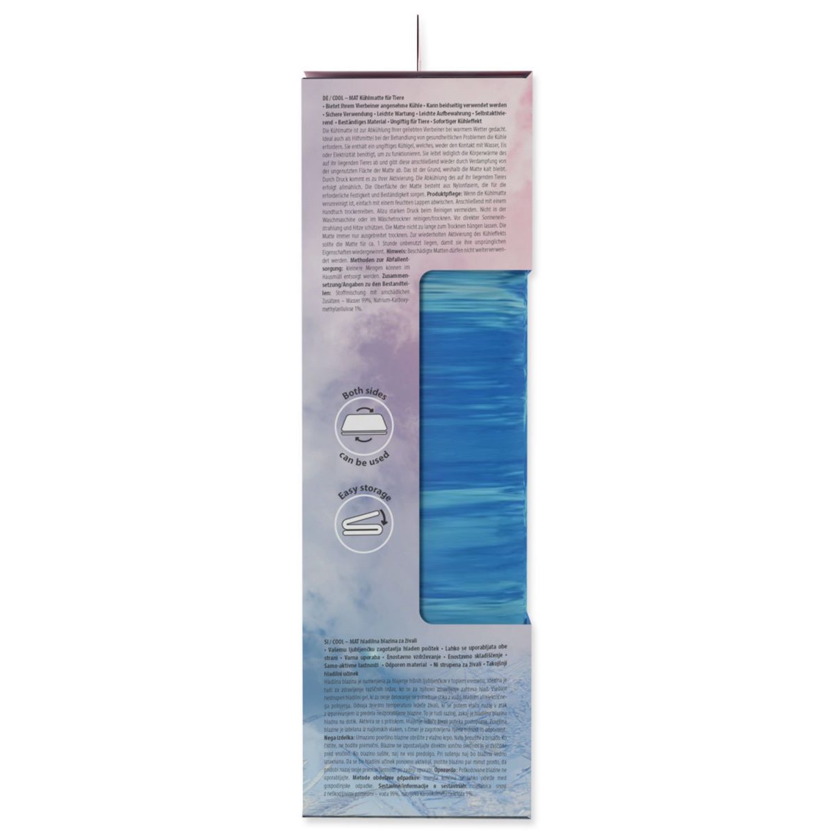 Péče o produkt: Znečištěný povrch podložky otřete vlhkým hadříkem. Následně vysušte ručníkem. Vyhněte se silnému nátlaku při čištění. Nepoužívejte pračku nebo sušičku. Nevystavujte ji na přímém slunečním záření a chraňte před teplem. Nenechávejte podložku dlouho viset při sušení. Při sušení mějte podložku vždy vyrovnanou. Pro opětovnou aktivaci chladícího efektu podložky nechte podložku pár minut volně, aby získala své původní vlastnosti po posledním užívání.