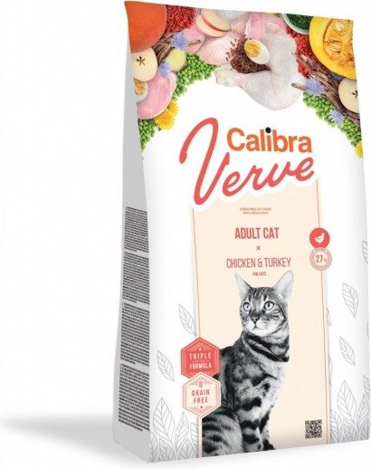 Calibra Cat Verve Adult Chicken & Turkey je kompletní krmivo s vysokým obsahem čerstvého masa bez obilovin – s kuřetem a krůtou. Receptura je určená pro dospělé kočky.