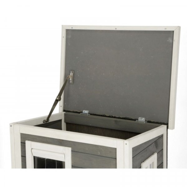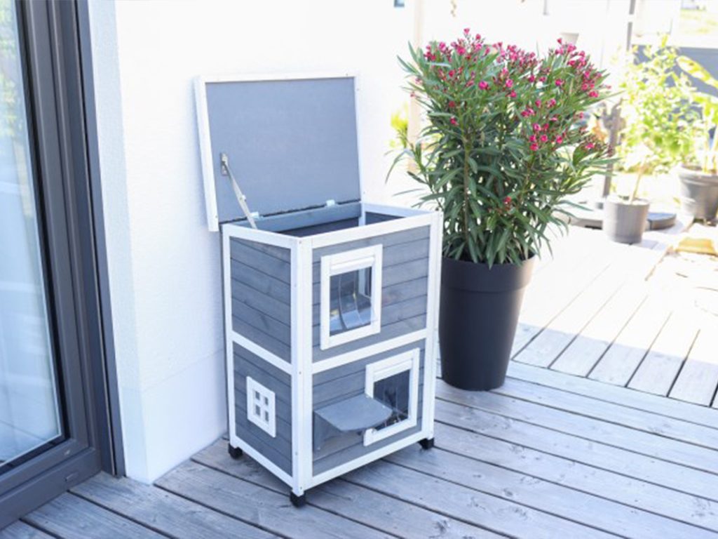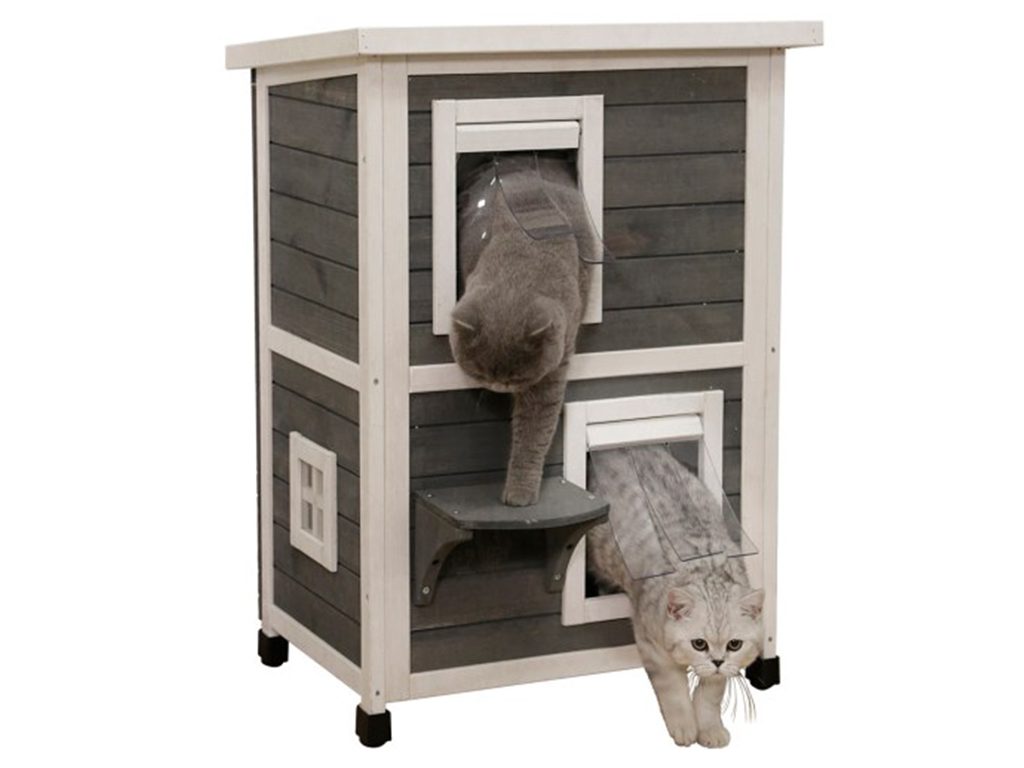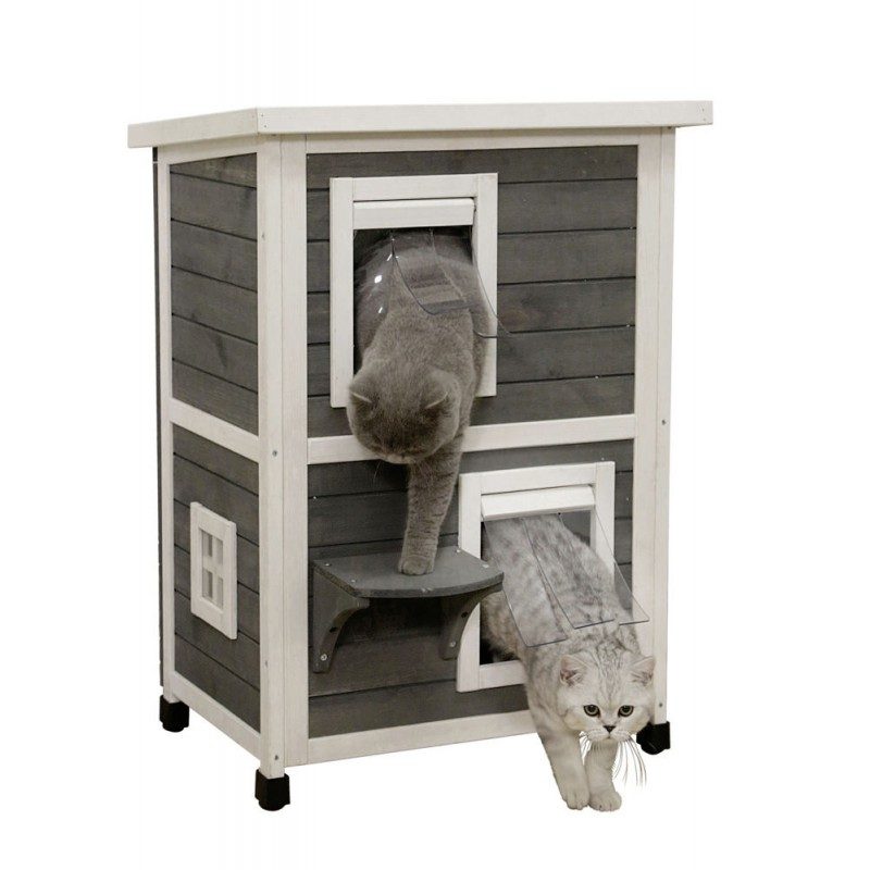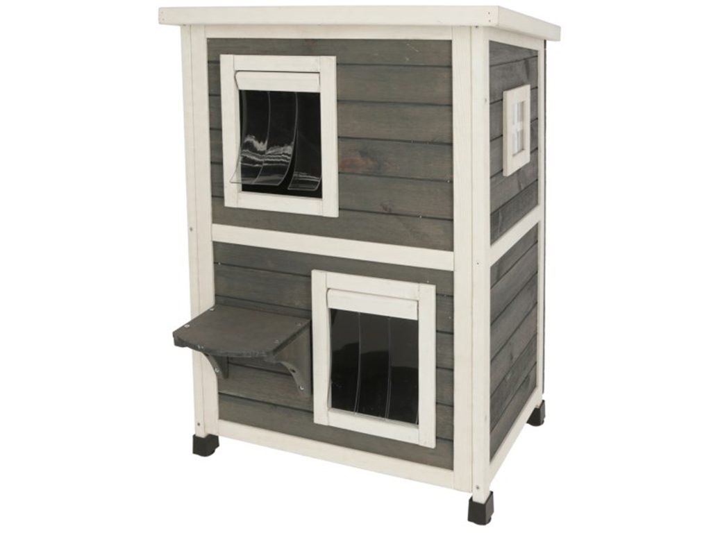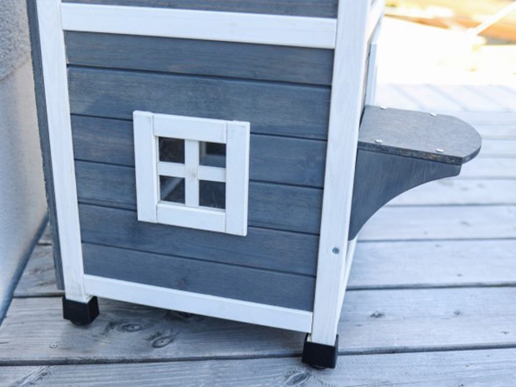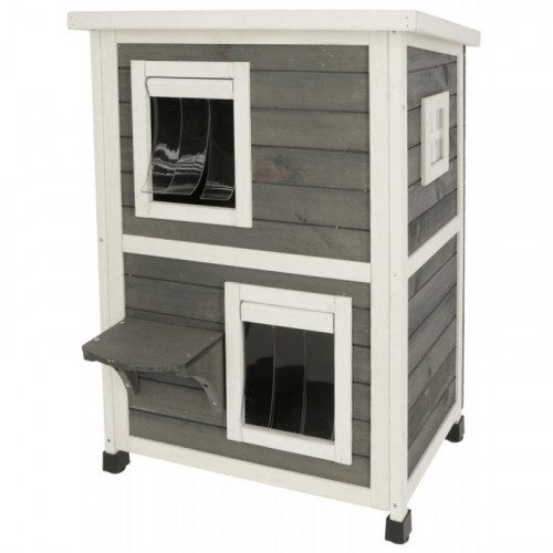 Bouda pro dvě kočky Family - dvoupatrová bouda pro kočky s odklápěcí bitumenovou střechou a výškově nastavitelnými nožkami. Bouda má 2 dvířka s odnímatelnými transparentními závěsy a v každém patře okno z plexiskla.