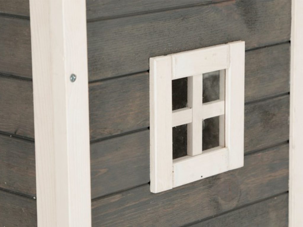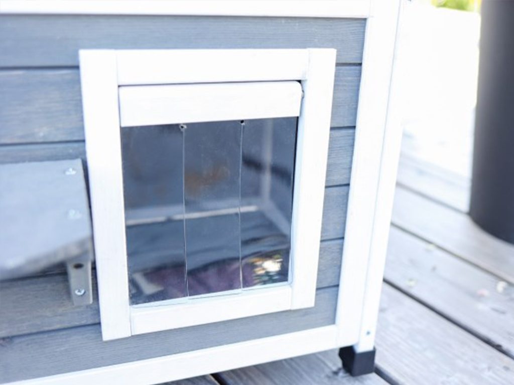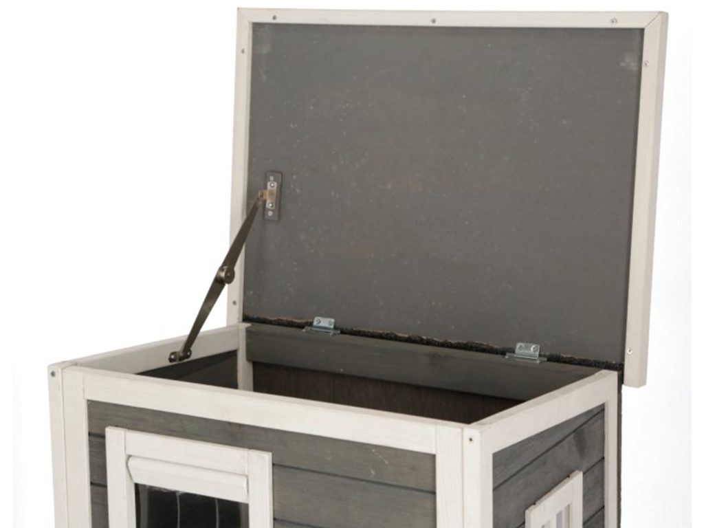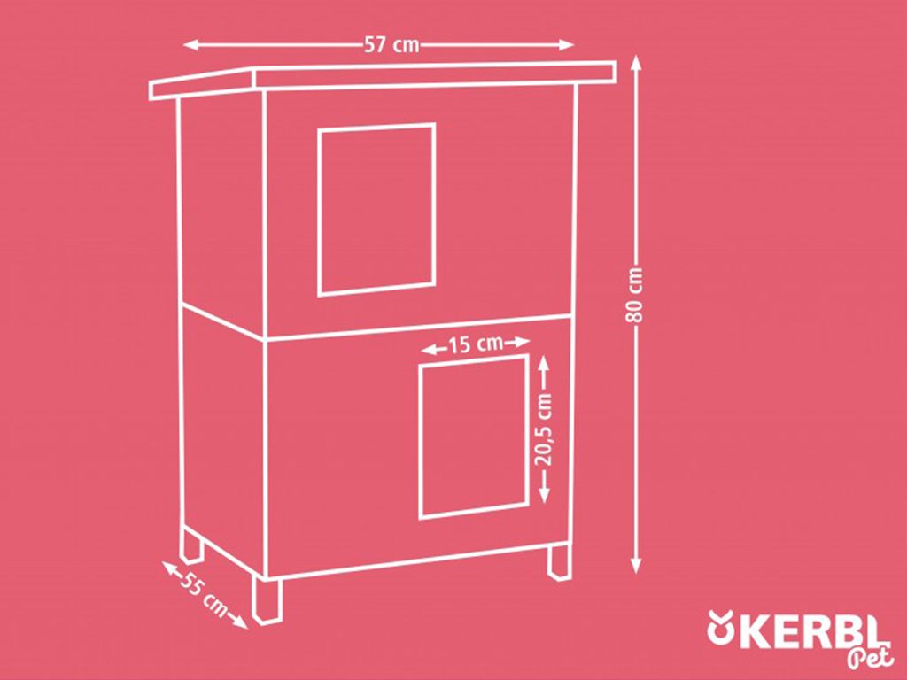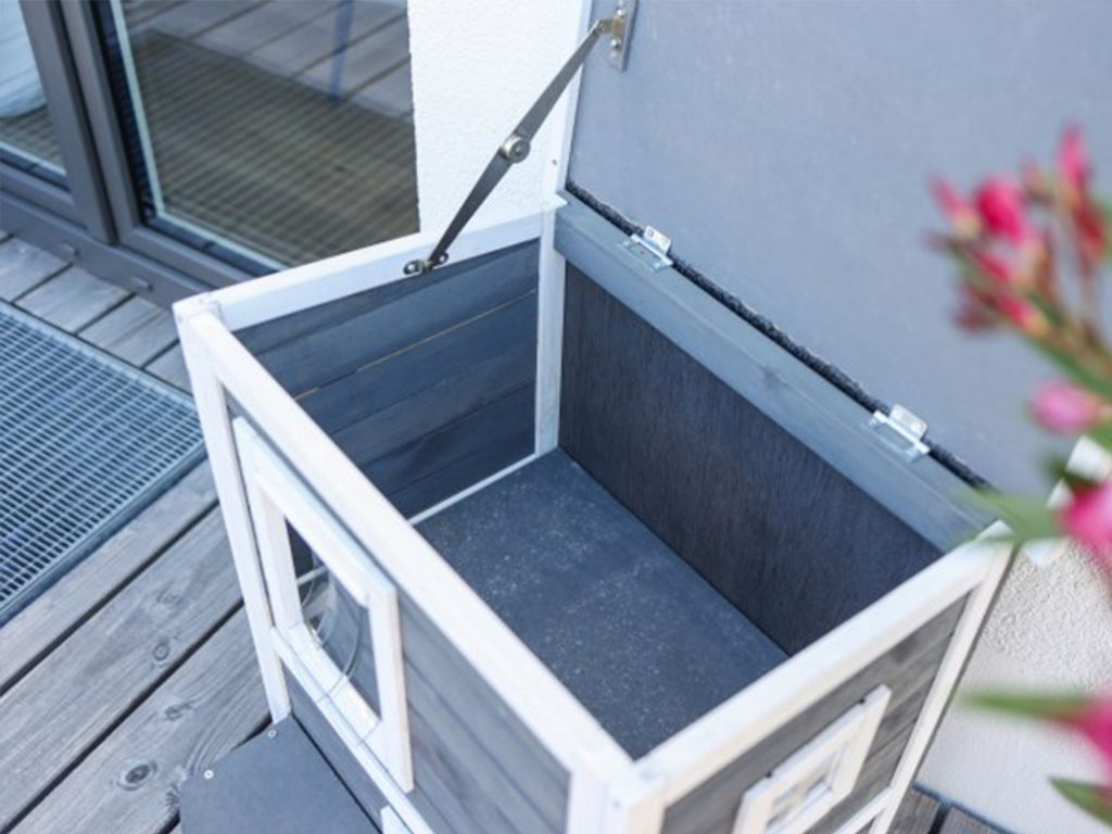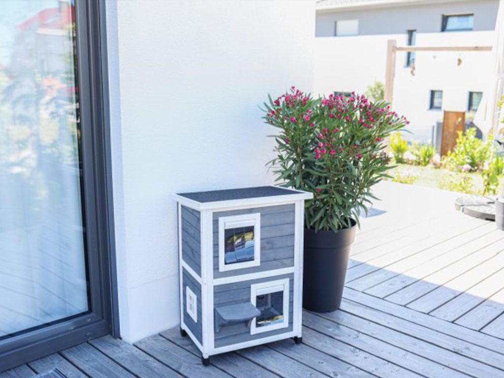 Bouda pro dvě kočky Family - dvoupatrová bouda pro kočky s odklápěcí bitumenovou střechou a výškově nastavitelnými nožkami. Bouda má 2 dvířka s odnímatelnými transparentními závěsy a v každém patře okno z plexiskla.