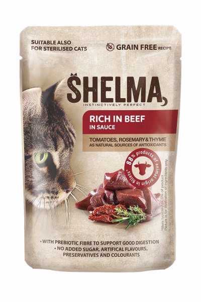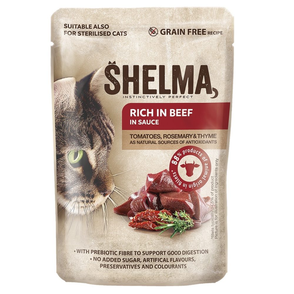 S rajčaty a bylinkami jako přírodními zdroji antioxidantů.Bez obilovin Bohaté na hovězí 88 % produktů živočišného původu ve filetkách, filetky obvykle tvoří 34,5 % produktu S rajčaty a bylinkami jako přírodními zdroji antioxidantů S prebiotickou vlákninou inulinem pro podporu dobrého trávení Bez přidaného cukru, umělých dochucovadel, konzervantů a barviv Vhodné i pro sterilizované kočkyImunita a kondice-s rajčaty, rozmarýnem a tymiánem jako přírodními zdroji antioxidantůPodpora trávení-s prebiotickou vlákninou inulinem, který se přirozeně nachází například v kořenu čekanky, pro podporu optimálního trávení a vyváženou střevní mikroflóruDobrý zrak a správná funkce srdces esenciální aminokyselinou taurinem, který je velmi důležitý pro podporu zraku a správné funkce srdceSilné a zdravé kosti a zuby-s vitamínem D3 pro silné a zdravé kosti a zubySložení: maso a výrobky živočišného původu (88 % ve filetkách*, z toho 40,6 % hovězí), zeleniny (0,45 % sušených rajčat jako ekvivalent 4 % rajčat), minerální látky, vedlejší výrobky rostlinného původu (0,4 % inulin), bylinky 0,05 % (0,025 % rozmarýn, 0,025 % tymián). *filetky obvykle tvoří 34,5 % produktuAnalytické složky: vlhkost 81 %, hrubý protein 10 %, hrubý tuk 3,5 %, hrubý popel 2,5 %, hrubá vláknina 0,4 %.Doplňkové látky: Nutriční doplňkové látky v 1 kg: vitamin D3 160 m.j., vitamin E 100 mg, zinek (jako síran zinečnatý monohydrát) 10 mg, mangan (jako oxid manganatý) 2 mg, měď (jako síran měďnatý pentahydrát) 1,2 mg, jód (jako jodičnan vápenatý bezvodý) 0,2 mg, taurin 520 mg, biotin 100 µg. m.j.