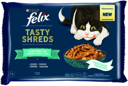 FELIX® Shreds jsou jemné a neodolatelné trhané kousky v lahodné šťávě, které si vaše kočka zamiluje! Vypadají, voní a chutnají tak lahodně, jako jídlo, které byste sami uvařili! Než jsou kousky natrhány a servírovány v neodolatelně chutné šťávě, jsou uvařeny přesně na tu správnou teplotu. Vaše kočka si opravdu zamiluje chuť kousků FELIX Shreds. Zároveň jsou zdrojem esenciální omega-6 mastné kyseliny a mají správnou kombinaci vitamínů, aby udržely vaši kočku plnou života a připravenou k uličnictví!