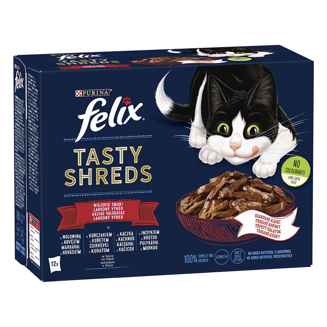 Kompletní krmivo pro dospělé kočky. FELIX Shreds jsou jemné a neodolatelné trhané kousky v lahodné šťávě, které si vaše kočka zamiluje! Vypadají, voní a chutnají tak lahodně, jako jídlo, které byste sami uvařili! Než jsou kousky natrhány a servírovány v neodolatelně chutné šťávě, jsou uvařeny přesně na tu správnou teplotu.