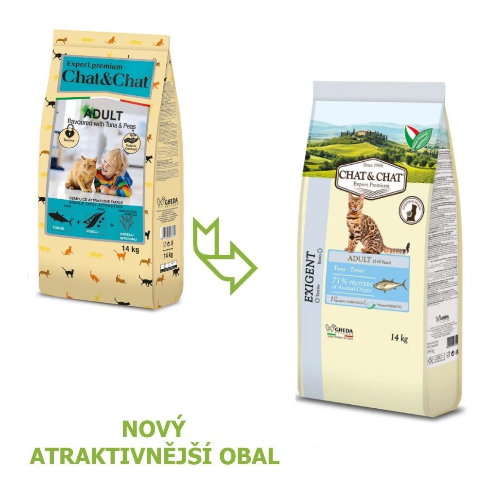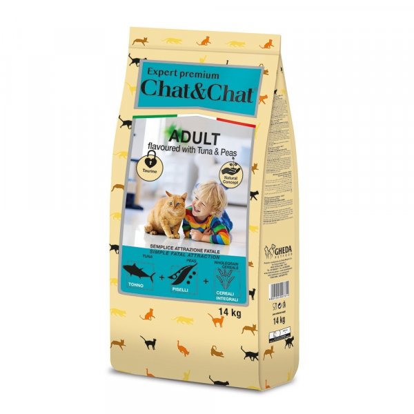 Kompletní krmivo pro dospělé kočky s tuňákem, hrachem a celozrnnými obilovinami.