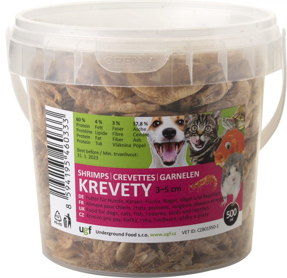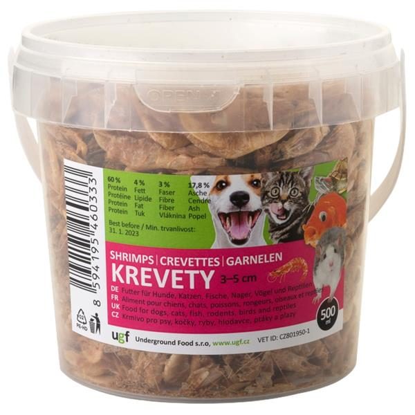 Krevety jsou doplňkovým krmením určeným pro psy, kočky, plazy, ryby (zejména KOI kapry), ptáky a hlodavce. Jedná se o 100% přírodní produkt s vysokým obsahem vysoce kvalitního a lehce stravitelného proteinu (60 %), Omega 3 nenasycených mastných kyselin, vápníku a vitamínů.