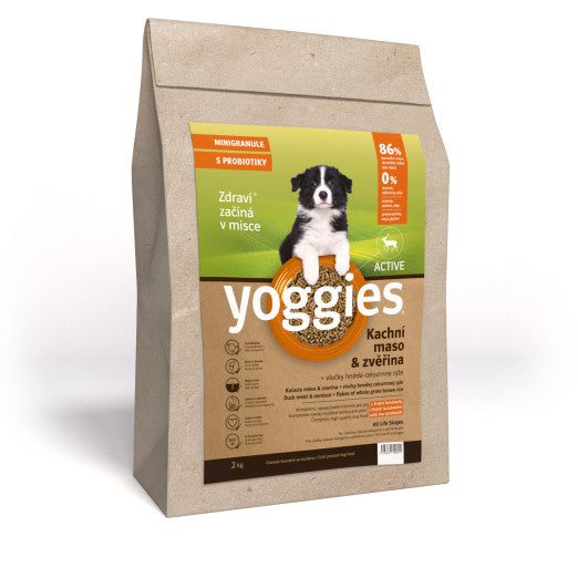 Za studena lisované granule Yoggies obsahují 86 % kvalitního masa před sušením – tzn. před ztrátou vody, která se v masu přirozeně vyskytuje. Po vysušení masa se tak objem zredukuje na cca 35-40 % celkové původní váhy. Probiotika v granulích podporují imunitu i zdravý trávicí trakt. Jsou výborně stravitelné a nebobtnají (potlačují riziko torze žaludku).