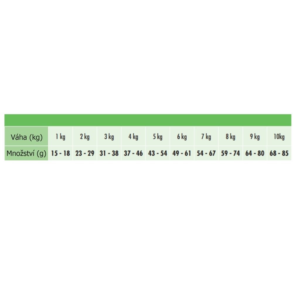 Složení: obiloviny (celozrnné cereálie 22 %), maso a výrobky živočišného původu (bílé maso drůbeže 15 %), deriváty rostlinného původu (sušená řepná dužina), oleje a tuky, rostlinné bílkovinné extrakty, ryby a rybí deriváty, zelenina (sušený hrášek 0,2 %).