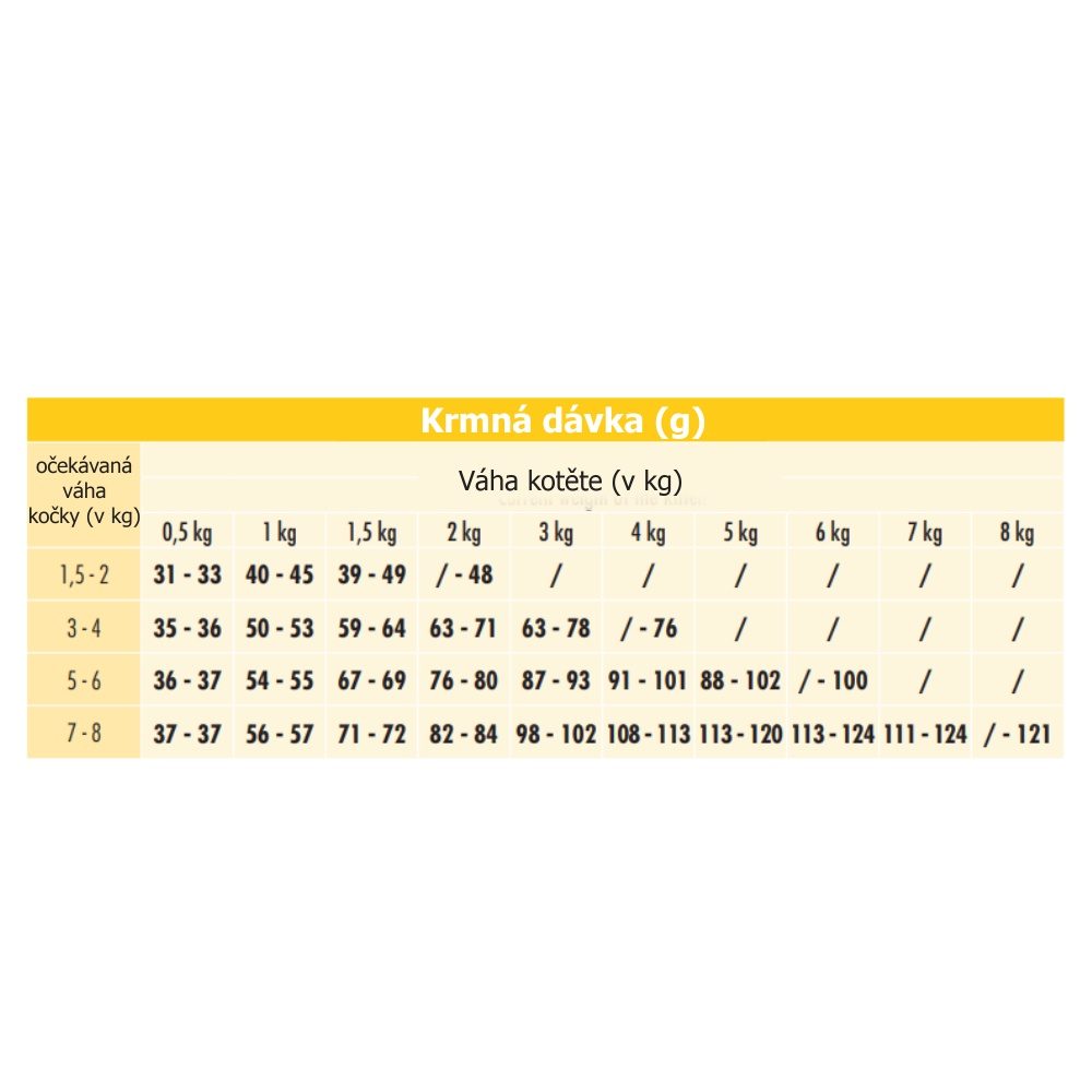 Kompletní krmivo pro koťata. Speciální složení uzpůsobené pro potřeby koťat. S obsahem taurinu pro zdravý zrak a srdce.