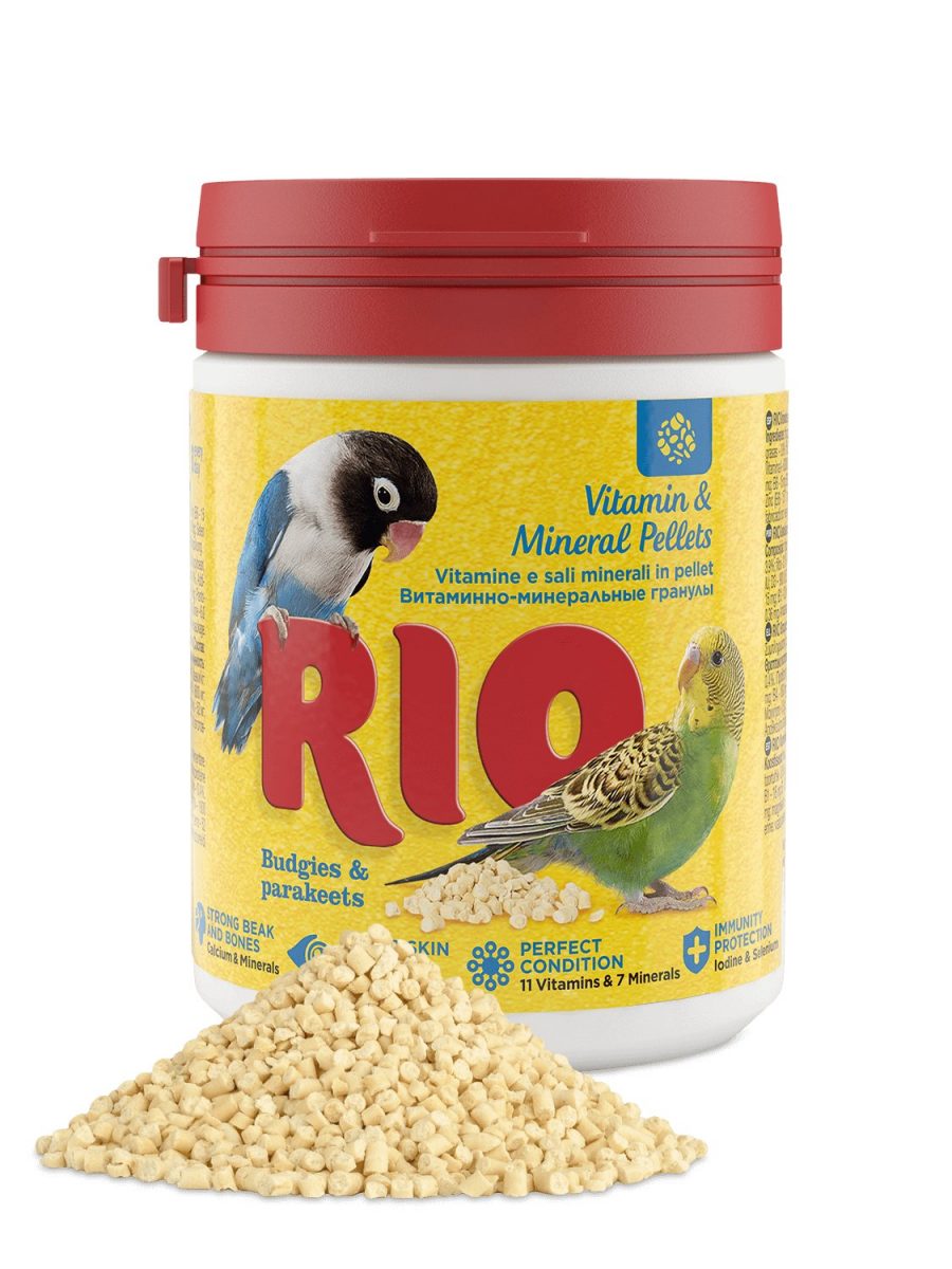 Vitamínové a minerální pelety RIO obsahují speciální komplex základních vitamínů, mikro a makro prvků pro maximální výživu a zdraví doma chovaných ptáků. Rio vitaminové a minerální pelety pro andulky a střední papoušky dodávají vitamíny a minerály, které často strava domácích ptáků postrádá. Například organismus ptáků produkuje vitamín D3 pouze v ultrafialovém světle. Kvůli nedostatku slunečního světla domácí ptáci nemohou syntetizovat dostatečné množství vitaminu D3. Každodenní používání pelet eliminuje příznaky a nežádoucí účinky nevyvážené stravy. Podporuje imunitní systém, zlepšuje zrak, stav pokožky a peří ptáků.
