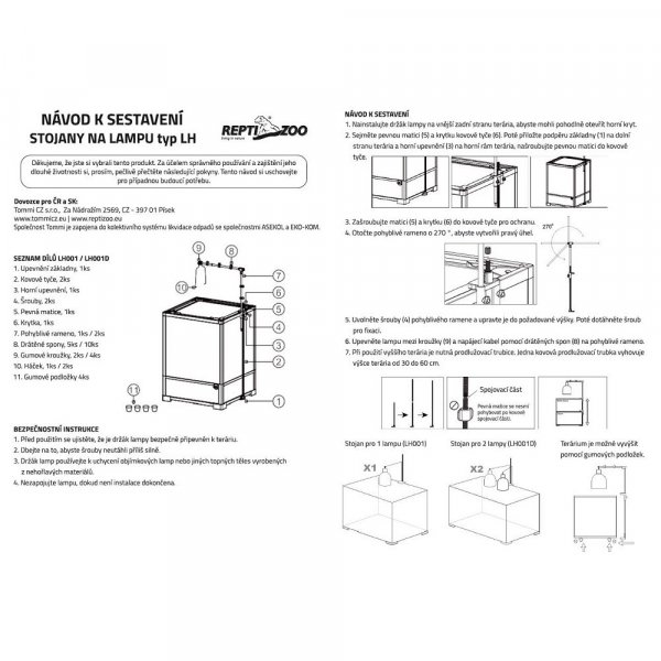 Držák vhodný pro instalaci na jakékoliv terárium. • Udržuje bezpečnou vzdálenost mezi žárovkou a zvířetem • Nastavitelný stojan pro lampy typu RL či DR • Stojan je vybaven držáky pro vedení kabelů • Výška a úhel zavěšení lampy jsou nastavitelné Nastavitelnost výšky od 30 do 60 cm