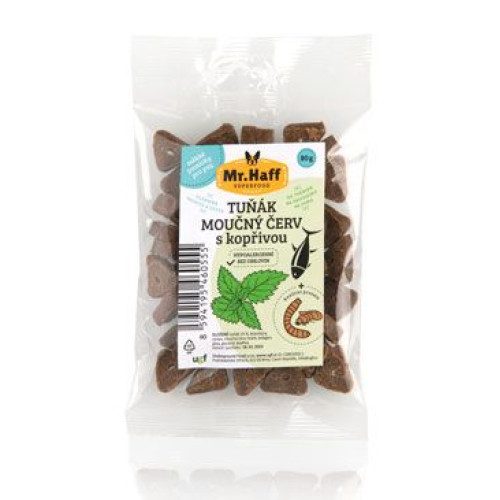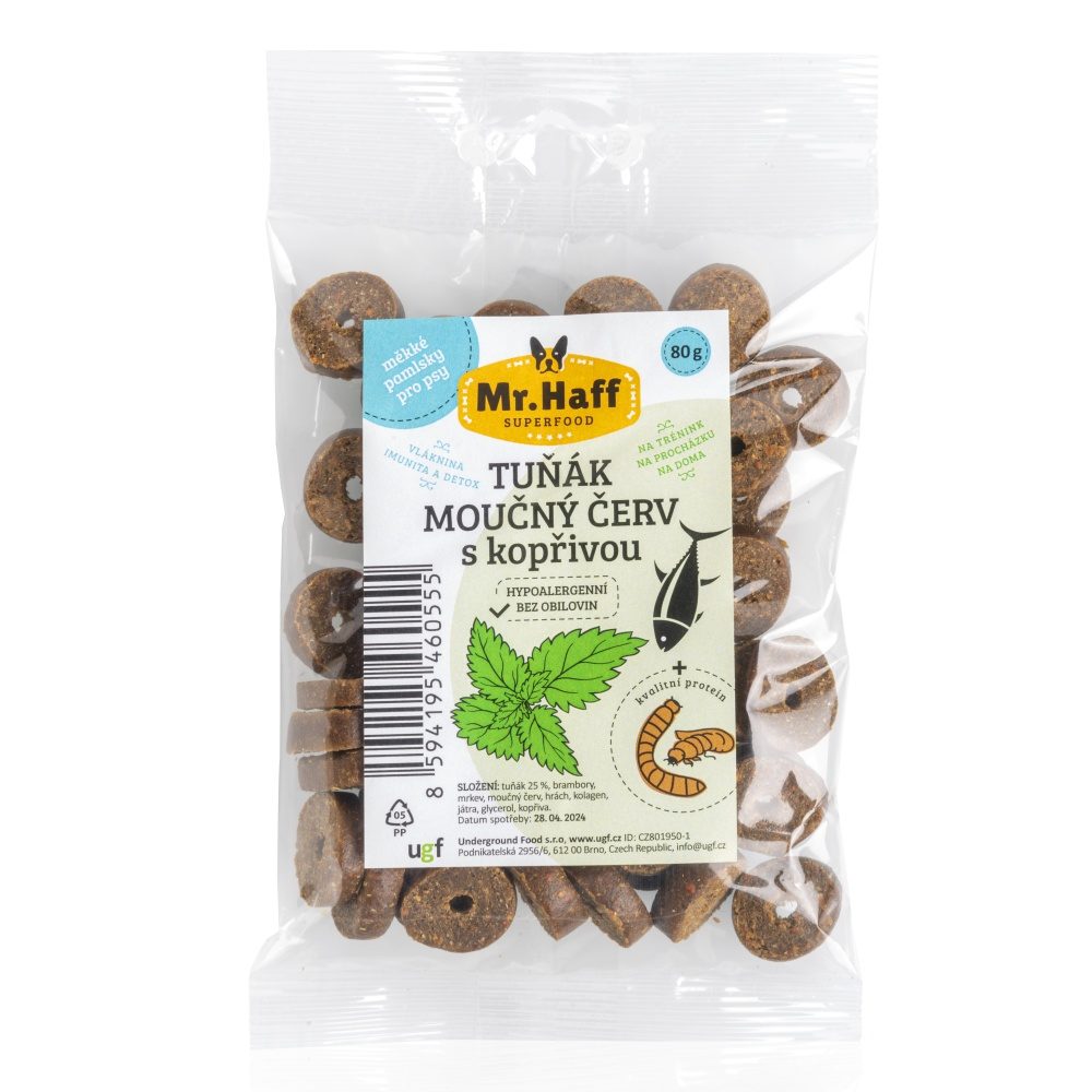 Neobsahují obiloviny ani drůbeží protein, a proto jsou skvělou volbou pro psy trpící potravinovými alergiemi. Tuňák-moučný červ a kopřiva kromě kvalitních bílkovin a tuků, které poskytuje tuňák i moučný červ obsahuje navíc velké množství minerálních látek a vitamínů. Kopřiva pak pomáhá podporovat metabolismus a je výbornou bylinou při detoxikaci.