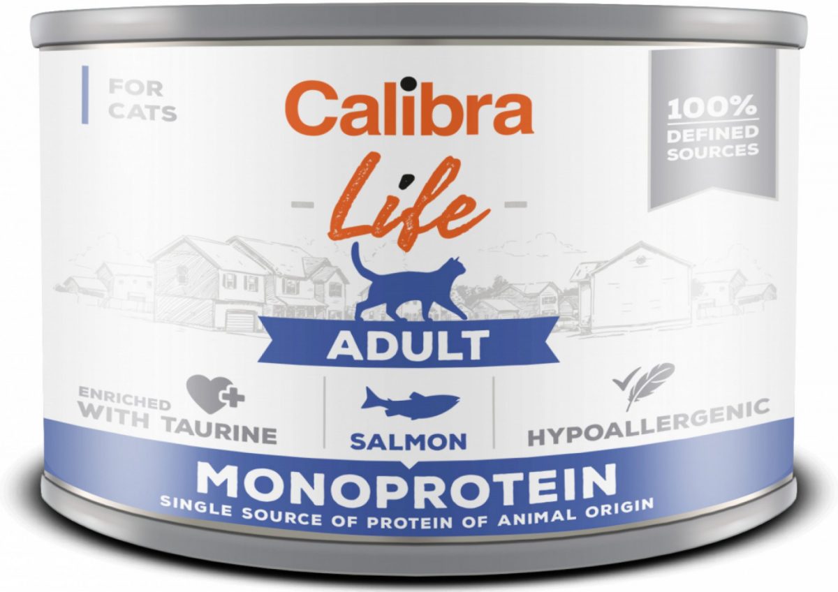 Calibra Cat Life Adult Salmon – receptura konzervy s lososem, která je určena pro dospělé kočky. Kompletní vlhké krmivo je založeno na jediném druhu proteinu, tato hypoalergenní receptura je sestavena z limitovaného počtu ingrediencí. Složení konzervy je bezobilninové a bezlepkové, což má vliv na lehkou stravitelnost. Obsahuje jen 100% specifikované suroviny té nejvyšší kvality. Součástí receptury je nezbytný taurin, který je důležitý zejména pro funkci zraku a na podporu srdeční činnosti, si kočky samy nedovedou vytvořit a je tudíž potřeba jim ho doplňovat. Receptura obsahuje lososový olej jako zdroj nenasycených mastných kyselin omega-3 (EPA, DHA) potřebných pro vývoj a funkci mozku, podporu fyziologické funkce kůže a srsti a jejich kvality. Mají také protizánětlivý účinek.