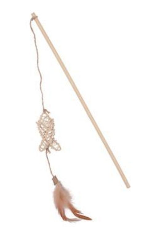 Ekologická hračka pro kočky - udice s ratanovou rybičkou a pírkem.
