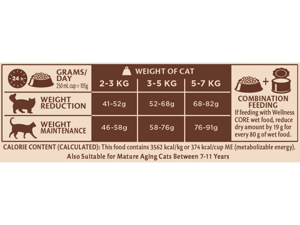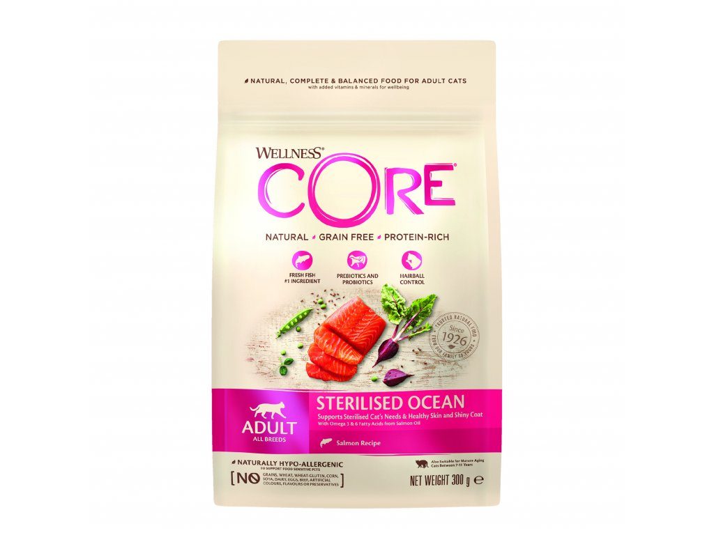 Zdravou pokožku, lesklou srst a optimální váhu zajistíte vaší kočce superprémiovým krmivem Wellness CORE Sterilised Ocean, které je zdrojem omega 3 a 6 mastných kyselin z lososového oleje. Krmivo, které bylo navrženo speciálně pro sterilizované kočky, udrží kočku zdravou a v optimální váze. Obsahuje pouze vysoce kvalitní bílkovinné přísady. Základem krmiva je čerstvé maso z lososa. Receptura bez drůbeže je ideální pro kočky, které potřebují jiný zdroj bílkovin (pro citlivé kočky, které nemohou jíst drůbeží proteiny). Se sníženým obsahem kalorií odpovídá sníženým potřebám méně aktivních nebo sterilizovaných koček. Zároveň je vhodné také pro starší kočky mezi 7-11 lety. Jedná se o přírodní, kompletní a vyváženou recepturu spolu s jedinečnou směsí zdravé zeleniny, superpotravin a doplňků výživy. Díky vysokému množství vlákniny podporuje snižování tvorby trichobezoárů.