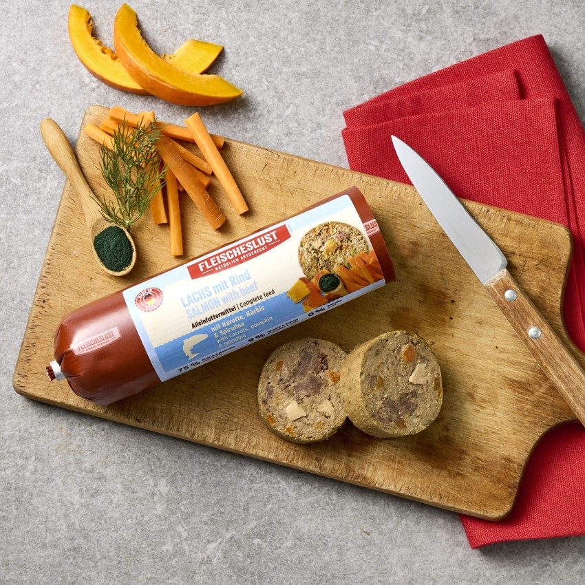 Tento salámek pro psy s lososem, hovězím masem, mrkví, dýní a spirulinou se skládá z 38% prémiového lososa a 37% nejjemnějšího hovězího masa a drobů. Jedná se o kompletní krmivo pro psy, které také obsahuje 9% křupavé zeleniny a bylinek. Mrkev je snadno stavitelná zelenina, která pozitivně působí na trávení. Dýně je vitamínová bomba, která nabízí spoustu vlákniny a minerálů, jenž stimulují metabolismus. Spirulina je nutriční zázrak. Podporuje imunitní systém a prospívá kůži a srsti.