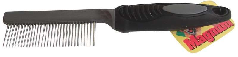 Hřeben s hustými ocelovými hroty pro perfektní rozčesání srsti včetně odstranění jemnějších nečistot. Velmi komfortní měkčená a neklouzavá rukojeť.