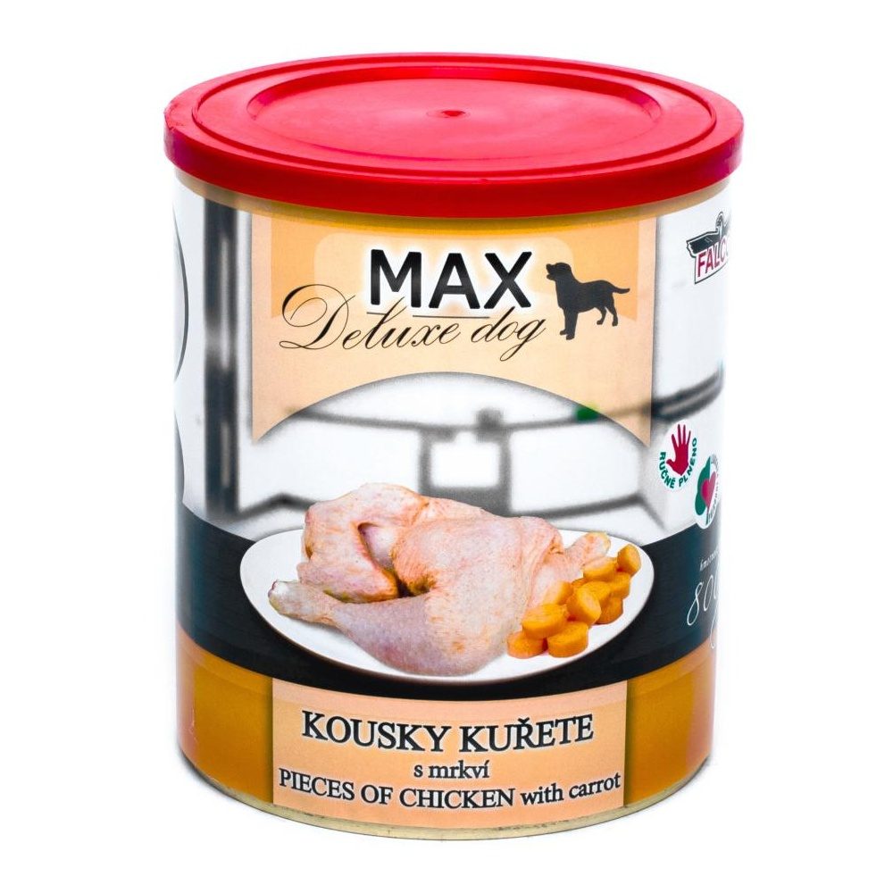 Nejlepší výběr kousků masa pro psy. Masová konzerva je naplněna z 93 % celými kousky nasekaného kuřete včetně kostí a 7 % mrkve.
