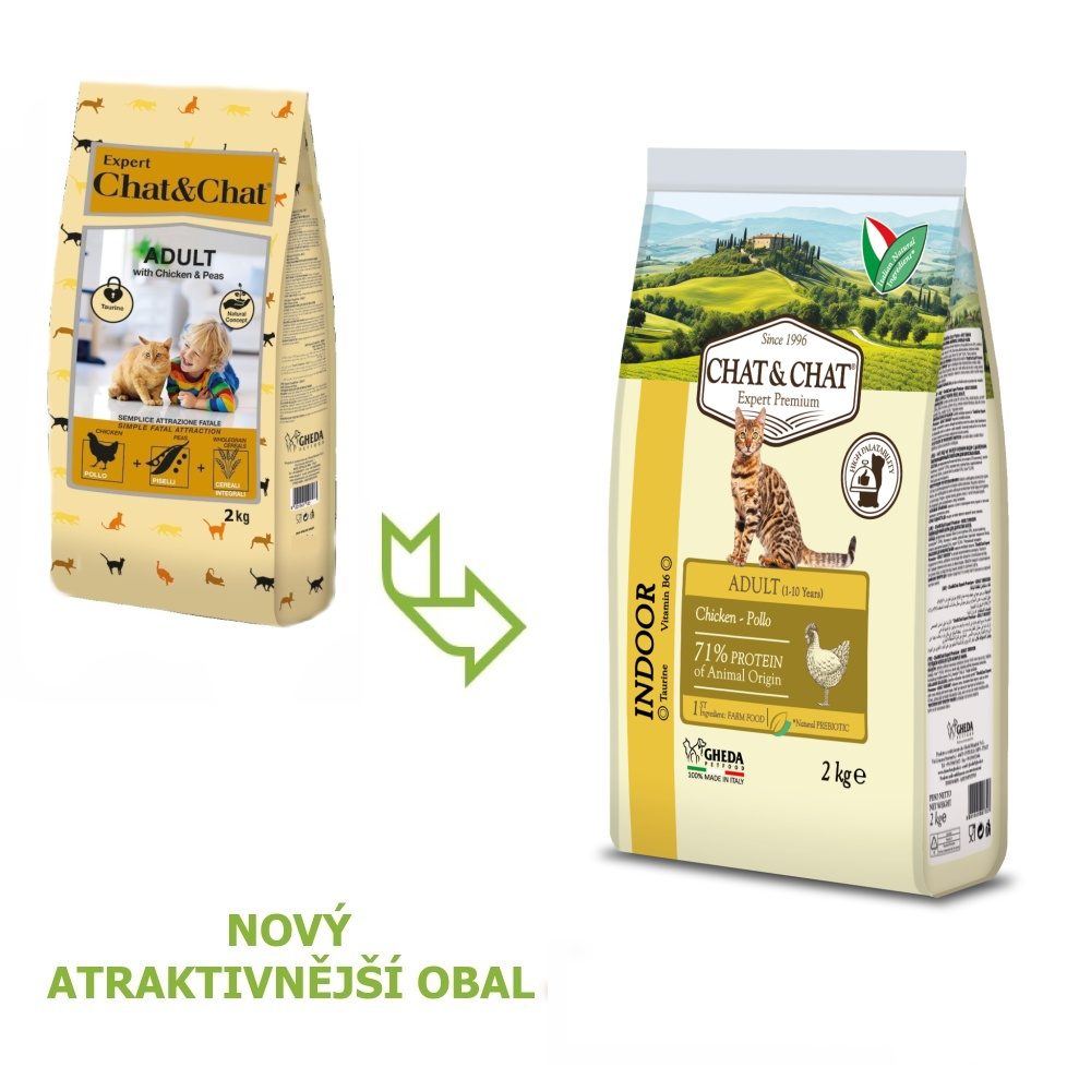 Kompletní krmivo pro dospělé kočky s kuřecím masem, hrachem a celozrnnými obilovinami.