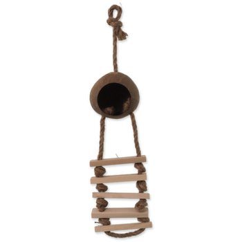 Závěsná budka z kokosu s dřevěným žebříkem na laně vhodná pro drobné exotické ptactvo. Vyrobeno z topolového dřeva, kokosu a sisalu. Velikost: 45 cm