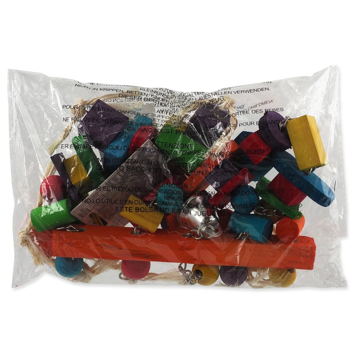 Závěsná hračka pro ptáky. Vyrobeno z topolového dřeva, sisalu a železa.