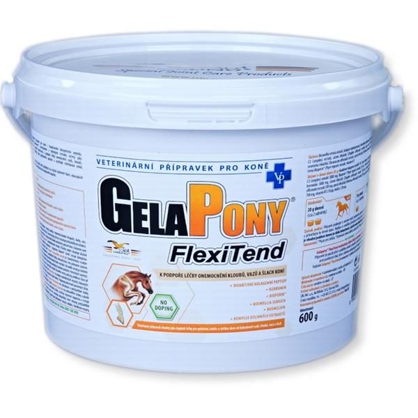 Gelapony® FlexiTend je veterinární přípravek pro koně s bioaktivními kolagenními peptidy, Boswellií serratou, kurkuminem, Bioperinem®, bromelainem a bylinnými extrakty určený jako doplněk léčby k potlačení zánětu, omezení bolestivosti a podpoře léčby onemocnění svalů, kloubů, vazů a šlach.