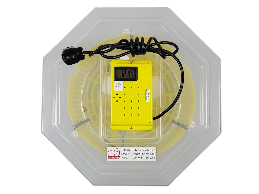 Teplotu je možné nastavit a případně i dále regulovat v rozsahu od 35 do 40°C za pomoci manuálního regulátoru u elektronické řídící jednotky. Panel je vybaven digitálním displejem s ukazatelem teploty a vlhkosti, a na levém boku otočným regulátorem pro potřebné nastavení teploty v líhni.