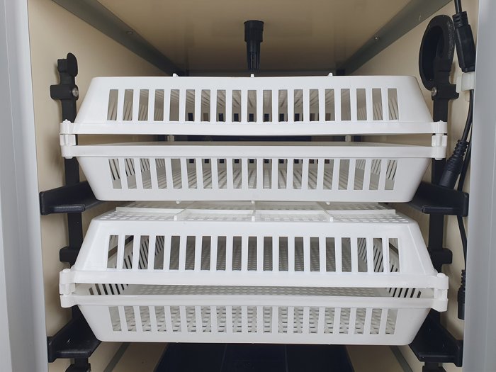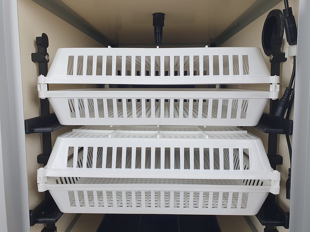 vhodná k líhnutí vodní a hrabavé drůbeže - pro kuřata, křepelky, kachny, krůty, husy a bažanty. S automatickým otáčením (2ks otočných roštů v balení) až 60ks slepičích vajec - možnost i ručního otáčení vajec (2ks košíků na dolíhnutí v balení), s alarmem teploty a vlhkosti, s regulací teploty od 36,6 do 38,3°C, s automatickou regulací vlhkosti, s teploměrem a s vlhkoměrem.