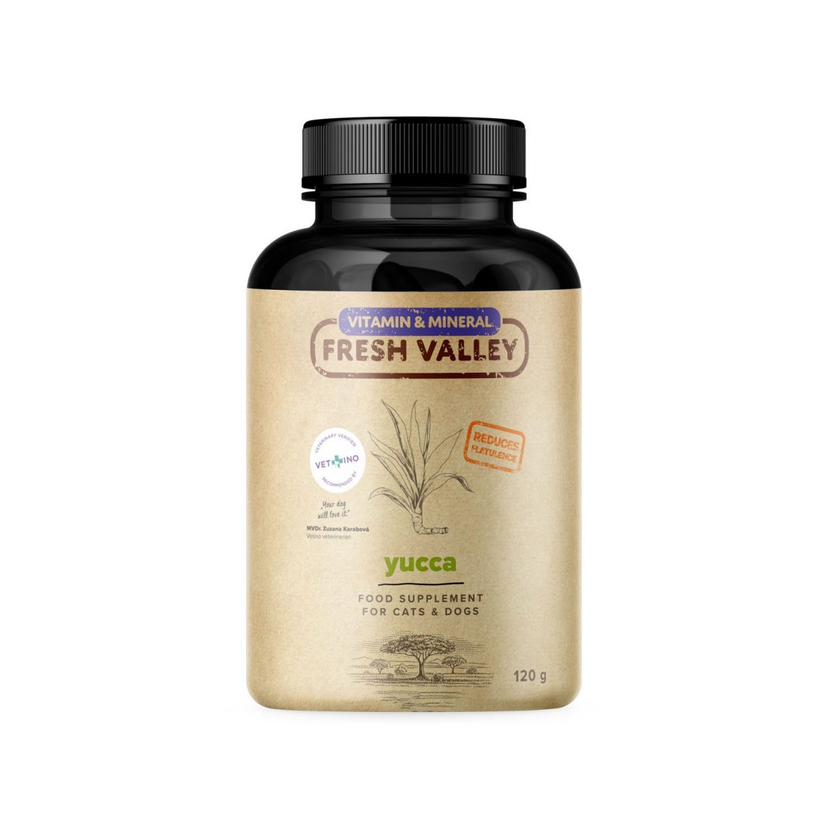 Doplňkové krmivo pro kočky a psy. Doporučený doplněk pro BARF. Yucca snižuje plynatost a zápach a zpevňuje stolici. Napomáhá zdraví kloubů a má protizánětlivé účinky.