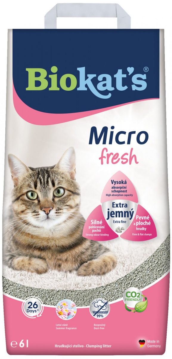 Ihned při styku s kapalinou hrudkuje, pohlcuje pachy a je velmi šetrná k tlapkám. Nepřichycuje se na srst a je zcela bezprašná.Jeden litr podestýlky Biokat´s Micro Fresh dokáže pojmout až 3 litry tekutiny. Díky této schopnosti je toto stelivo nesmírně ekonomické a vydrží na dlouhou dobu. Drobnější granulky umožňují nasypat do toalety méně steliva cca 3–4 cm. V několika vteřinách váže nepříjemné pachy a tvoří kompaktní a pevné hrudky.