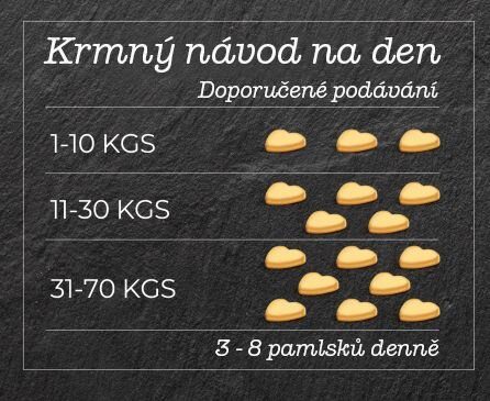Podávejte doporučené denní množství sušenek podle hmotnosti psa (viz foto). Ponižte přiměřeně množství denní krmné dávky