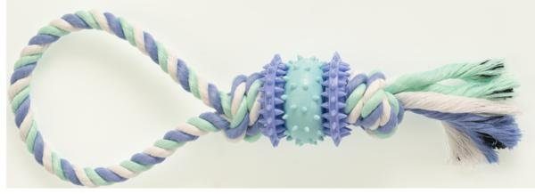 Hračka z bavlny a termoplastické gumy je skvělá kombinace dvou typů materiálů. Bavlněný provaz slouží k čištění zubů a TPR plast zase dlouho odolá psím zubům.