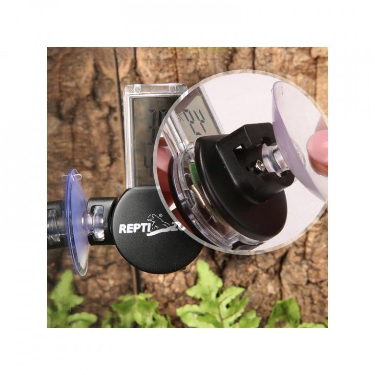 - Přísavka nesoucí teploměr může být namontována na přední, zadní nebo boční stranu terária, což usnadňuje instalaci v teráriu.